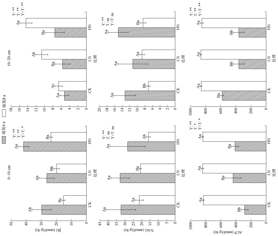 4 结论1) 施氮4 a仅显著影响各土层ACP活性,在LN、HN处理下0 ~ 10 cm土层ACP酶活性显著升高,10 ~ 20 cm土层ACP活性显著下降;而施氮8 a显著增强了各土层βG活性,在HN处理下各土层的NAG活性显著降低,各处理ACP活性则无显著变化。