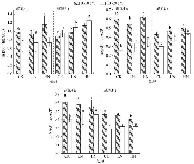 施氮4 a后,与CK、LN处理相比,HN处理下0 ~ 10 cm土层中ln(βG)∶ln(NAG)以及两土层ln(βG)∶ ln(ACP)均显著提高,但两土层ln(NAG)∶ln(ACP)均无显著变化(图 2)10 ~ 20 cm土层ln(βG)∶ln(NAG)、ln(βG)∶ln(ACP)和ln(NAG)∶ln(ACP)均显著低于0 ~ 10 cm土层。施氮8 a后,与CK、LN处理相比,HN处理下各土层ln(βG)∶ln(NAG)明显提高,且随着土层的增加而增加(图 2);HN处理下0 ~ 10 cm土层ln(NAG)∶ln(ACP)显著低于CK和LN处理;10 ~ 20 cm土层ln(βG)∶ln(ACP)和ln(NAG)∶ln(ACP)均显著低于0 ~ 10 cm土层。
