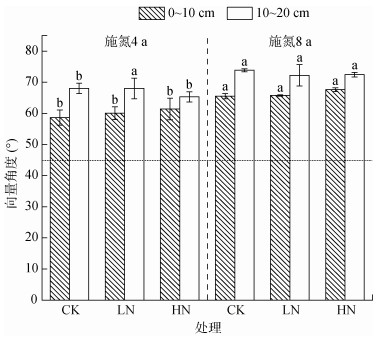 不同施氮年限下,两土层在不同施氮量下土壤酶化学计量比的向量角度均 > 45°,但施氮8 a的向量角度显著大于施氮4 a的向量角度(图 3)。