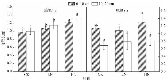 施氮4 a后,各土层土壤酶化学计量比的向量长度随着施氮量的增加而显著增加(图 4)。施氮8 a后,0 ~ 10 cm土层,土壤酶化学计量比的向量长度随着施氮量的增加而显著增加;10 ~ 20 cm土层,HN处理下土壤酶化学计量比向量长度显著大于CK和LN处理,而CK和LN处理之间差异不显著。