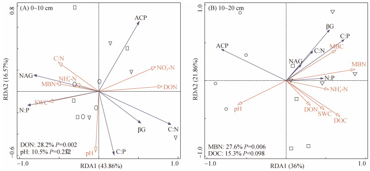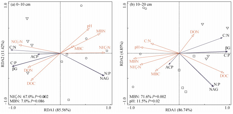 冗余分析结果(图 5)表明,施氮4 a后,在0 ~ 10 cm土层中,DON含量显著影响土壤酶活性及其化学计量比,解释了土壤酶活性及其化学计量比变化的28.2%;DON含量与βG活性呈正相关,与NAG和ACP活性呈负相关,并且DON含量与ln(βG)∶ln(NAG)和ln(βG)∶ln(ACP)呈正相关,与ln(NAG)∶ln(ACP)呈负相关。在10 ~ 20 cm土层中,MBN含量与土壤酶活性显著相关,解释了土壤酶活性及其化学计量比变化的27.6%,且与βG和NAG活性呈正相关,与ACP活性呈负相关(图 5)。
