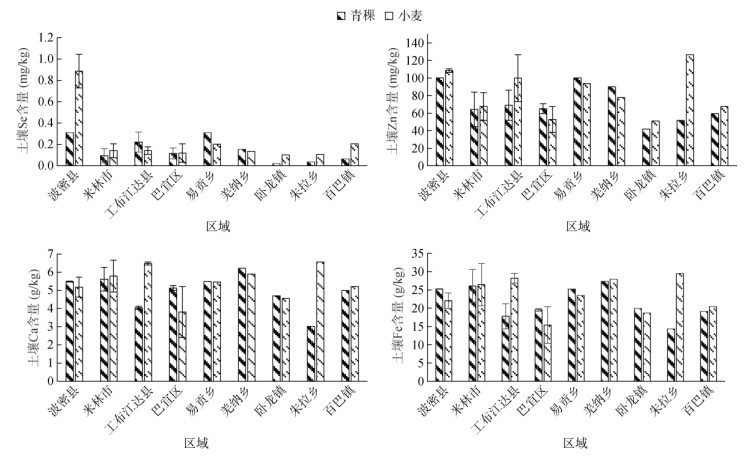 图 2 相同区域栽培青稞、小麦土壤Se、Zn、Ca和Fe含量比较 Fig. 2 Soil total Se, Zn, Ca and Fe contents in highland barley fields and wheat fields at same site |
