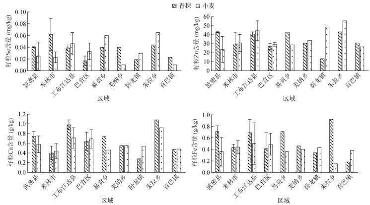 图 3 相同区域栽培青稞、小麦籽粒Se、Zn、Ca和Fe含量比较 Fig. 3 Total Se, Zn, Ca and Fe contents in highland barley and wheat grains at same site |