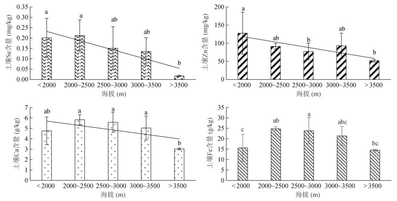 (图中小写字母不同表示不同海拔间差异显著(P < 0.05)) 图 4 不同海拔土壤Se、Zn、Ca、Fe含量分布 Fig. 4 Total Se, Zn, Ca and Fe contents in soils at different altitudinal gradients |