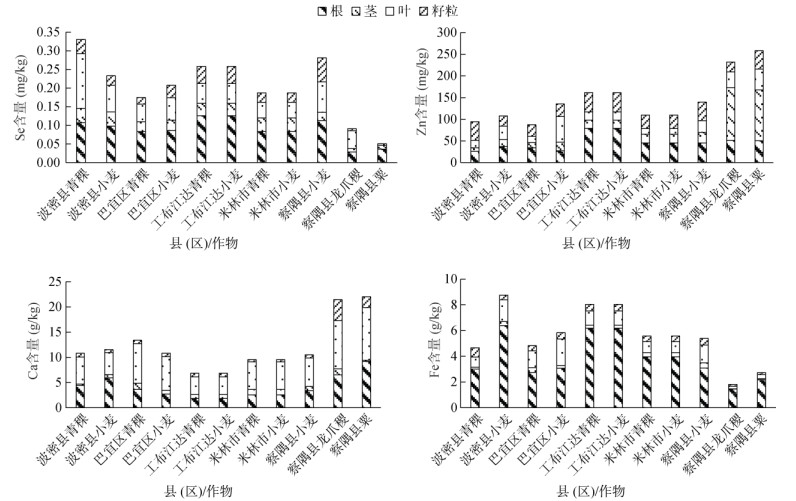 图 5 Se、Zn、Ca、Fe在作物体内的分布 Fig. 5 Total Se, Zn, Ca and Fe contents in different crop organs |