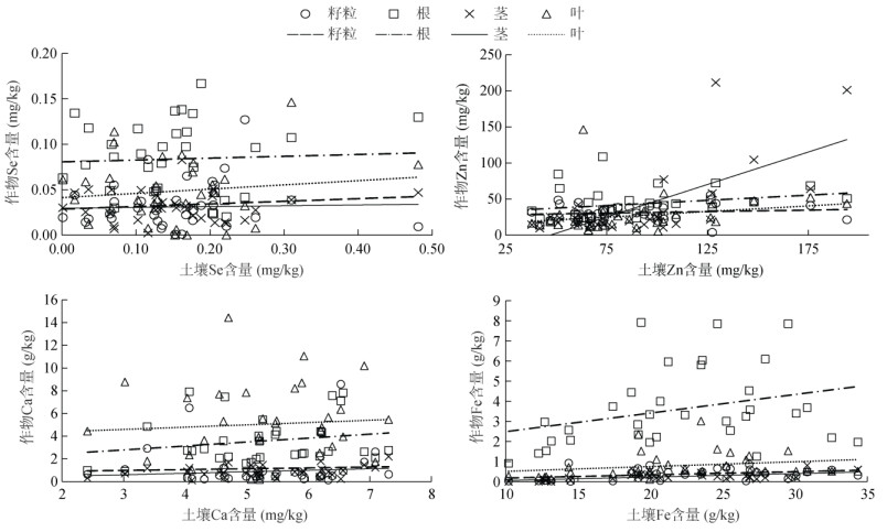 图 6 作物不同部位与其栽培土壤Se、Zn、Ca、Fe含量的关系 Fig. 6 Relationships between contents of total Se, Zn, Ca and Fe in different organs of crops and farmland soil |