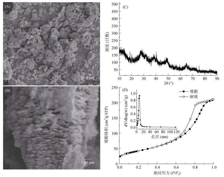 (A:样品的整体形貌图;B:典型的单个微粒形貌图;C:样品的X射线衍射图;D:样品的N2吸脱附曲线和相应的BJH孔径分布曲线) 图 1 无定形铝水合氧化物的表征 Fig. 1 Morphological characterization of amorphous Al hydroxide |