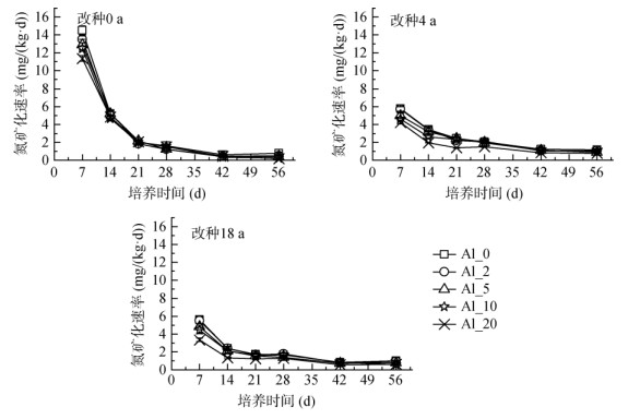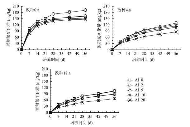 图 2 不同无定形铝氧化物添加量下土壤有机氮矿化进程 Fig. 2 Processes of soil nitrogen mineralization under different amorphous Al hydroxide treatments |