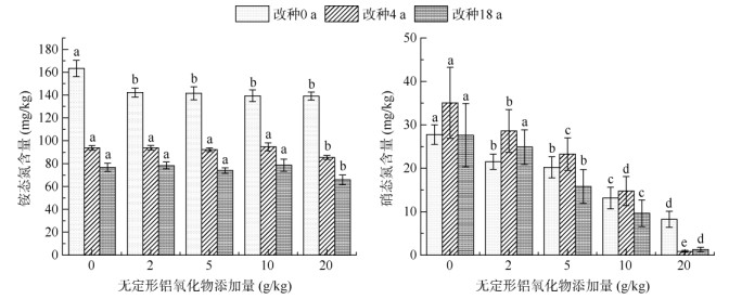 (图中不同小写字母表示同一种植年限土壤不同无定形铝氧化物添加量间差异显著(P < 0.05)) 图 5 不同无定形铝氧化物添加量下土壤矿化氮中铵态氮和硝态氮含量 Fig. 5 Contents of mineralized ammonium and nitrate nitrogen under treatments with various amorphous Al hydroxide addition rates |