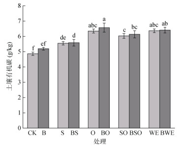 2 结果与分析 2.1 土壤有机碳含量由图 1可知,单施有机物料、膨润土与有机物料配施两种不同处理模式均可以增加土壤有机碳含量。与CK处理相比,单施有机物料的S、O、SO、WE处理均可显著提升土壤有机碳含量,增幅分别为14.0%、30.5%、23.9%、30.8%;膨润土与有机物料配施的BS、BO、BSO、BWE处理下有机碳含量分别显著提升了14.8%、35.1%、26.2%、31.8%。与不添加膨润土的5种处理相比,添加膨润土的有机物料处理均不同程度地提升了土壤有机碳含量,相对于S、O、SO、WE处理,添加膨润土后,有机碳在BS、BO、BSO、BWE处理下的增加量分别提高了5.2%、15.1%、9.3%、3.1%。