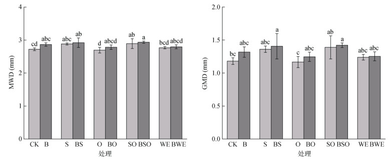 各处理对团聚体水稳性指标(MWD、GMD)的影响如图 2所示,膨润土与有机物料配施模式下的MWD值均高于单施有机物料模式。与CK处理相比,BS、BSO处理均显著增加了MWD值。在BSO处理下MWD值达到最大,为2.94。不同处理下水稳性团聚体GMD变化规律与MWD基本一致,BS、BSO处理均可显著提高GWD值,BSO处理下GWD值最高,为1.42。