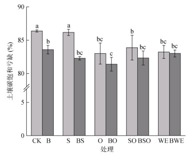 由表 3可知,有机物料和膨润土的添加影响团聚体有机碳贡献率。各处理中有机碳主要分布在 > 0.25 mm的大团聚体中,< 0.002 mm的团聚体中贡献率较小,但相对含量较高。与CK处理相比,添加膨润土均可以提高 > 0.25 mm大团聚体和 < 0.002 mm微团聚体有机碳贡献率,B、BS、BO、BSO、BWE处理下 > 0.25 mm大团聚体有机碳贡献率增幅分别为2.4%、9.8%、4.8%、14.8%、4.4%;< 0.002 mm微团聚体有机碳贡献率分别为16.5%、17.4%、19.2%、7.2%、8.5%。与不添加膨润土处理(S、O、SO、WE)相比,添加膨润土的有机物料处理(BS、BO、BSO、BWE)分别将 > 0.25 mm土壤团聚体有机碳贡献率提高了4.4%、4.9%、9.9%、5.0%。