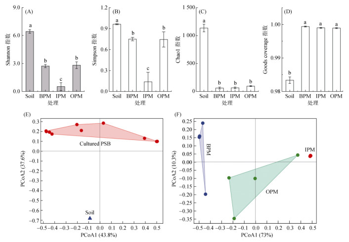 (Soil表示供试土壤;culturable PSB表示可培养解磷菌;BPM、IPM和OPM分别代表常规细菌培养基、无机磷细菌培养基和有机磷细菌培养基;小写字母不同表示差异达P < 0.05显著水平。下图同) 图 1 基于phoD基因的土壤和培养基中解磷菌群落多样性(OTU水平) Fig. 1 Diversity comparison of phoD-based phosphate-solubilizing bacteria community in soil and media at OTU level |