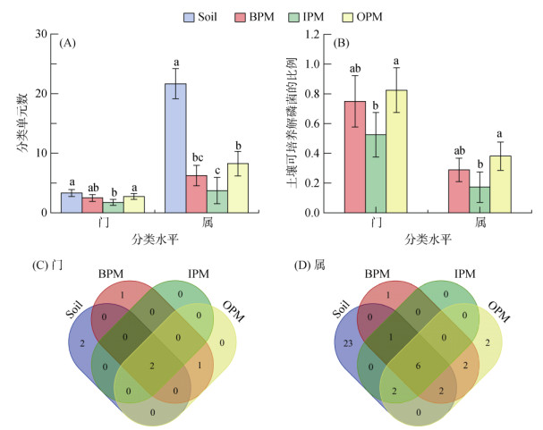 1.7 数据分析采用Excel和SPSS Statistics 19软件进行基础数据分析。采用单因素方差分析(one-way ANOVA)和Duncan法进行方差分析和多重比较,差异显著性水平为P < 0.05。门、属水平下优势解磷菌类群的判断依据为相对丰度 > 1%。通过α多样性分析和基于Bray-Curtis距离算法的主成分聚类分析(Principal coordinates analysis,PCoA)确定OTU水平的解磷菌群落多样性和结构差异,通过ANOSIM法进行组间差异显著性分析。利用韦恩图(Venn diagram)探究不同样品之间共有和特有解磷菌类型。通过LEfSe(LDA effect size)分析和Wilcoxon检验得到不同处理样品之间门和属水平上存在差异的解磷菌类群。采用Origin Pro 2021制图。
