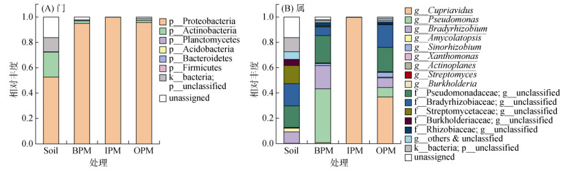 2.3 不同培养基中可培养解磷菌群落组成由图 3可知,在门水平(图 3A),土壤本底优势有机解磷菌为Proteobacteria(52.7%)和Actinobacteria (19.8%)。不同菌落富集物中,Proteobacteria均为最优势可培养解磷菌,占比95.8% ~ 99.9%。在属水平(图 3B),土壤本底与可培养解磷菌群落组成差异更大。首先,土壤本底与不同培养基可培养解磷菌共有属6个,分别为Pseudomonas、Bradyrhizobium、Cupriavidus、Sinorhizobium、Xanthomonas和Actinoplanes,但相对丰度在样本间差异较大;土壤本底解磷菌群落中Bradyrhizobium相对丰度最高(9.12%),其次为Amycolatopsis(2.95%);BPM主要富集了Pseudomonas(42.6%)、Bradyrhizobium(18.4%)、Sinorhizobium(1.50%)等;IPM富集优势解磷菌主要为Cupriavidus(99.7%);而OPM富集优势解磷菌,除Cupriavidus(36.8%)外,还包括Bradyrhizobium (7.54%)、Pseudomonas(7.62%)和Sinorhizobium(3.79%)等,其余属相对丰度均低于1%。另外,属水平未分类(unclassfied)phoD基因序列在土壤样本中占比高达59.6%,在菌落富集物中占比最高可达40.7%。
