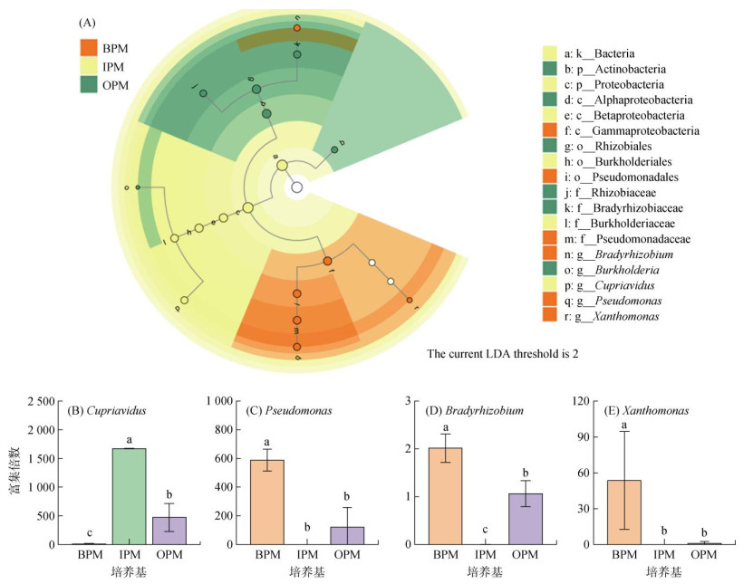 (图 4A为基于LEfSe分析的解磷菌群落差异,节点大小对应于该分类单元的平均相对丰度;空心节点代表组间差异不显著的分类单元,而其他颜色的节点则表明这些分类单元体现出显著的组间差异,且在该色所代表分组样本中丰度较高;字母则标识了组间存在显著差异的分类单元的名称。图 4B ~ 4E为显著差异的解磷菌属在不同培养基中的富集倍数比较) 图 4 不同培养基中土壤可培养解磷菌群落的差异比较 Fig. 4 Differences of soil culturable phosphate-solubilizing bacteria communities in different media |
