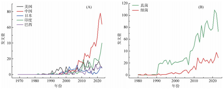 1.2 纤维素降解微生物在Web of Science核心数据库中,以“纤维素生物降解”为关键词进行了文献检索(图 1A),共检索到3 003篇文献。数据表明,该领域研究大致在20世纪90年代开始引起关注,美国最先开始了研究,我国相对起步较晚,但随着时间的推移,我国在近十年内取得了巨大的研究进展。此外,以“真菌”和“细菌”为分类标准对纤维素降解微生物进行文献计量分析(图 1B),其中真菌占据绝对优势,在一定程度上反映了真菌在纤维素降解方面受到了极高的关注。