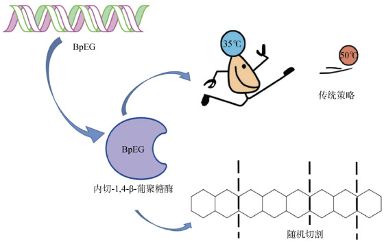 图 2 内切-1, 4-β-葡聚糖酶在低温下对纤维素聚合物的随机切割方式[80] Fig. 2 Endo-1, 4-β-glucanase BpEG randomly cleaves cellulose polymers at low temperature |