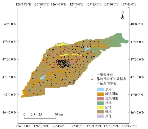 本研究在耕地土壤中采集了255个土壤样品(0 ~ 20 cm),样点布设结合基础网格、加密点与随机点3种方法。基于基础网格法布设土壤采样点位,样点间距4 km,对于土壤农业利用强度较高的地区进行加密布点,且对于上述样点未覆盖到的地区进行随机布点。由于海伦市中部农业活动较为频繁,选择该区域作为海伦市典型农业区,并进行作物与根系土的成对取样。根系土与作物样点的布设采用基础网格法,样点间距为8 km。
