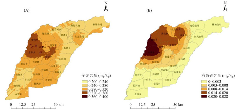 图 2 土壤全硒(A)与有效硒(B)的空间分布 Fig. 2 Spatial distributions of soil total (A) and available (B) Se contents |