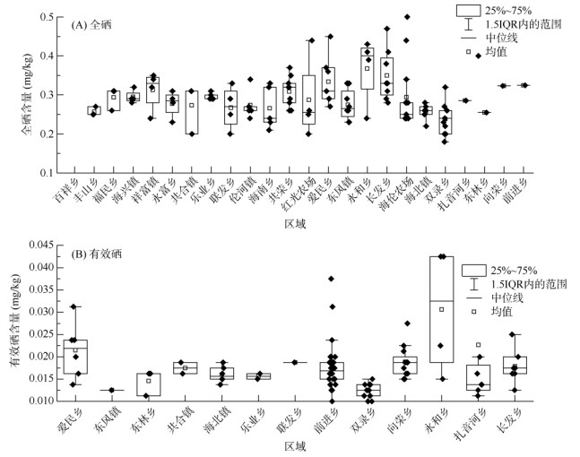 按不同区域对土壤全硒与有效硒含量水平进行划分(图 3),永和乡、长发乡、爱民乡、向荣乡、前进乡的土壤全硒水平较高,平均值均高于0.320 mg/kg;永和乡、扎音河乡、爱民乡和向荣乡的土壤有效硒水平较高,平均值均高于0.018 mg/kg。