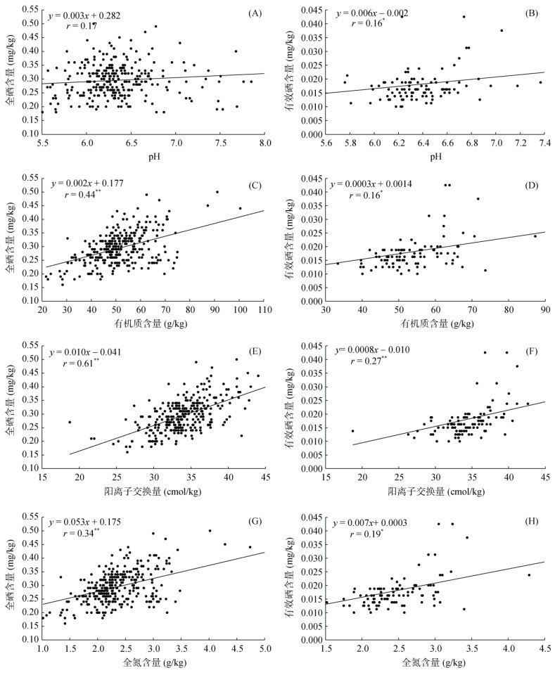 全硒含量与有效硒含量均与土壤阳离子交换量呈极显著正相关(P < 0.01),相关系数分别为0.61和0.27。阳离子交换量能够直接反映土壤的保肥供肥性能和缓冲能力,因此阳离子交换量越高的土壤能固定、吸附土壤中更多的硒。研究区内主要分布黑土,有机质含量较高,土壤无机矿质黏粒和有机质黏粒含量较高,导致能够吸附和交换土壤溶液中的各种阳离子数量增多,增加了土壤中硒的吸附交换,进而提高了土壤中硒的含量。