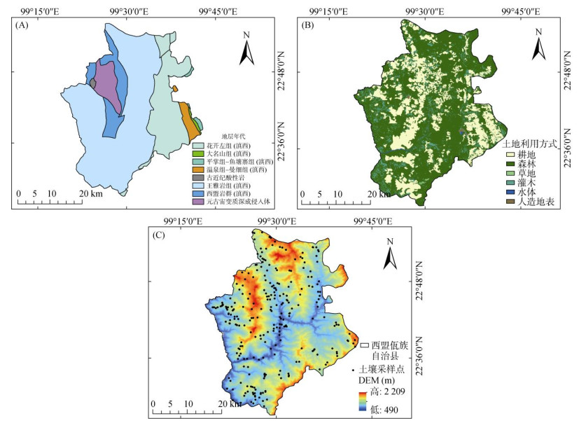 图 1 研究区土壤母岩类型(A)、土地利用类型(B)、DEM及土壤采样点分布(C) Fig. 1 Parent rock types (A), land use types (B), DEM and soil sampling sites (C) in study area |