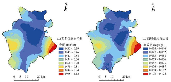 图 2 研究区土壤全硒、有效硒含量空间分布 Fig. 2 Spatial distributions of soil total and available Se contents in study area |