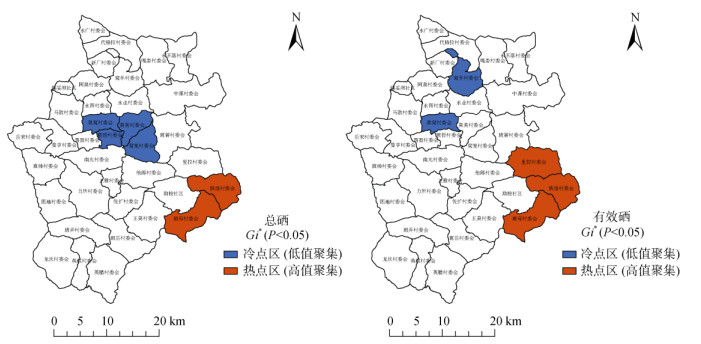 图 3 研究区土壤全硒和有效硒冷热点区分布 Fig. 3 Spatial distribution of cold–hot spots of soil total and available Se in study area |