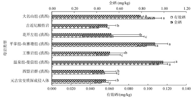 (图中小写字母不同表示不同母岩类型间土壤全硒或有效硒含量差异显著(P < 0.05),下同) 图 4 不同母岩类型土壤全硒、有效硒含量 Fig. 4 Soil total and available Se contents with different parent rock types |