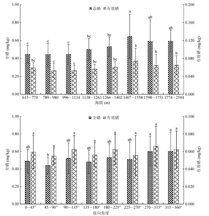 图 5 土壤全硒、有效硒含量与海拔、坡向关系 Fig. 5 Relationship between soil total and available Se contents with altitude and slope aspect |