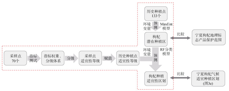 综合来说,本研究分两部分进行,第一步,识别宁夏的枸杞潜在种植区;第二步,完成潜在种植区内枸杞的种植适宜性分区(图 2)。