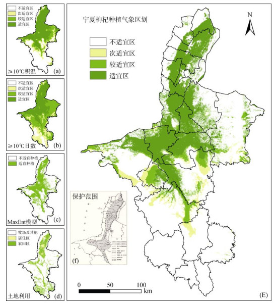 ≥10 ℃年积温和≥10 ℃累计日数图层叠加后,枸杞气候适宜种植区面积约占宁夏总面积的68%;MaxEnt模型识别的枸杞潜在种植区面积约占宁夏的39%,前者面积大于后者,后者几乎都在前者范围内。将MaxEnt模型识别的枸杞潜在种植区与国家标准GB/T 19742—2008[34]中划定的宁夏枸杞地理标志产品保护范围比较(图 3F,阴影部分)发现,二者在黄河灌区的范围基本一致,但前者的南界更远,到达了固原市原州区范围(与实地调查相符),而后者仅划分到同心县中部。将MaxEnt模型识别的枸杞潜在种植区与宁夏近年土地利用情况比较发现,除南部六盘山冷湿区外,枸杞潜在种植区范围包括了现有农田区及农田与牧场交界边缘区。矫正后(删除居住区部分)枸杞潜在种植区约占宁夏总面积的37%,裁切气候区划图,获得了改进的枸杞种植气候区划(图 3E),其中适宜区占72%,较适宜区占16%,次适宜区占12%。