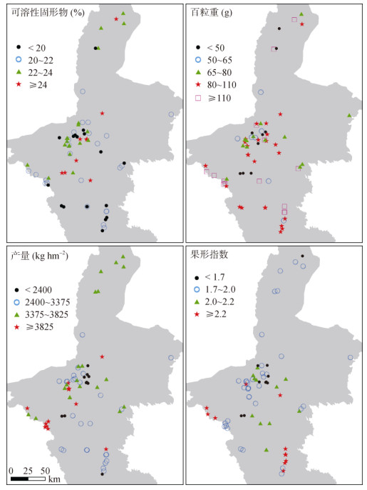 2.2 宁夏枸杞种植适宜性评价 2.2.1 枸杞质量指标统计分析从变异系数看(表 1),百粒重变异系数最大,果形指数变异系数最小;从偏度看,除产量表现为负偏态(偏度小于0)外,其他均表现为正偏态,其中可溶性固形物的偏度最大,百粒重偏度最小;从峰度看,与正态分布峰度比较,可溶性固形物表现为明显正峰态,其次是果形指数,百粒重的峰度最接近正态分布。枸杞可溶性固形物的平均值为21.9%,按照GH/T 1302—2020中的鲜果等级划分标准[30],所有采样点枸杞的可溶性固形物均达到特等水平(≥15%);百粒重平均值为86.6 g,与上述标准比较,超过1/2样点的枸杞鲜果百粒重达到特等水平(≥80 g)。