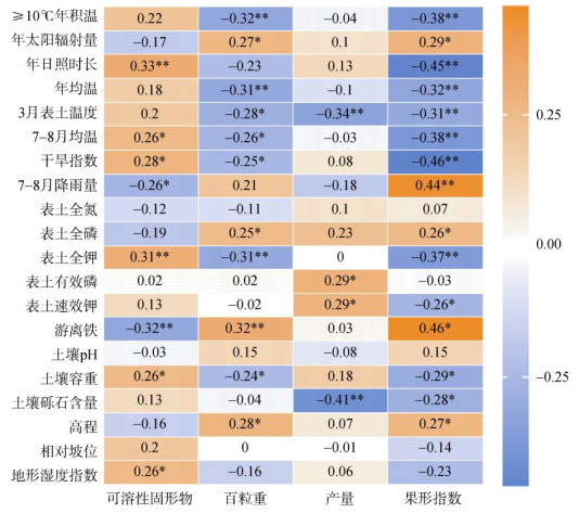 为进一步理解4个枸杞质量指标与环境变量的关系,选择对上述主成分贡献较大的气候、土壤、地形因子,建立与枸杞质量指标的相关关系矩阵(图 5)。气候因素中,枸杞可溶性固形物与日照时长、温度因素、干旱指数呈显著正相关,与降雨量呈显著负相关;土壤因素中,枸杞可溶性固形物与表层土壤全钾含量、容重呈显著正相关,与游离铁含量呈显著负相关;地形因素中,可溶性固形物与地形湿度指数呈显著正相关。鲜果百粒重对环境的响应几乎与枸杞可溶性固形物相反,因为温度高会加快枸杞的成熟[7],使百粒重减小,这同样会影响到果形指数。产量主要受土壤因素的影响,与有效磷、速效钾呈显著正相关,与土壤砾石含量呈显著负相关。气候因素中,温度高、降雨多均不利于产量形成。果形指数对环境变量的响应与百粒重几乎一致,但果形指数表现得更敏感,与环境变量相关性更强。