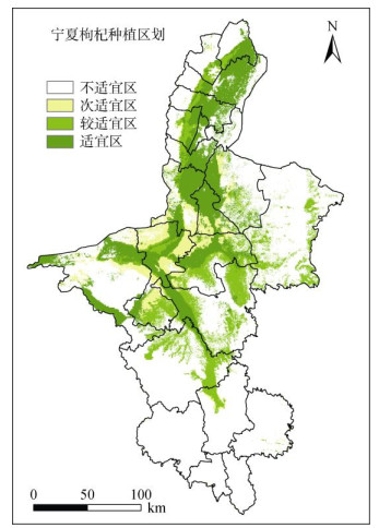 如图 6所示,从分布上看,枸杞适宜区主要分布在黄灌区,其次是中宁县到同心县之间的狭长谷地以及宁夏西部与甘肃省靖远县接壤的兴仁镇及周边区域;较适宜区分布范围广,如北部的贺兰山山麓地带、黄河低阶地上、东部干旱低丘区,南部黄土丘陵区均有分布;次适宜区主要分布在卫宁平原附近的低丘岗地上。从分布面积上看,适宜区面积最大,占枸杞潜在种植区面积的47%,较适宜区占35%,次适宜区面积最小,占18%。