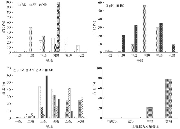 2 结果与分析 2.1 土壤肥力质量评价研究区土壤肥力质量指标统计特征见表 3,土壤肥力质量指标等级分布见图 2。上海外环绿带土壤容重普遍偏大,均值为1.42 g/cm3,最大值达1.71 g/cm3,变异系数为8.39%,属于弱变异;土壤容重主要分布三级、四级、五级和六级,占比之和达95.24%,四级和五级占比最大,均为28.57%。总孔隙度偏低,均值为43.6%,变异系数为16.2%,中等变异;总孔隙度全部分布在二级、三级和四级,二级占比为50.0%。非毛管孔隙均值为1.17%,整体偏低,变异系数为70.4%,中等变异;非毛管孔隙均分布在四级。
