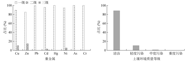 2.2 土壤环境质量评价研究区土壤环境质量指标统计特征见表 4,土壤环境质量指标单因子分级和综合分级见图 3。上海外环绿带全Cu、全Zn、全Pb、全Cd、全Hg、全Ni、全As和全Cr含量均值均低于GB36600—2018《土壤环境质量建设用地土壤污染风险管控标准(试行)》要求的第二类筛选值[15]。所有重金属含量等级主要分布在一级,全Cu一级占比为89.4%,全Zn一级占比为85.1%,全Cd一级占比为95.7%,全Ni一级占比为94.68%,全Pb、全Hg、全As和全Cr均为100%。
