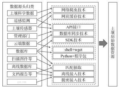 在遵循国家相关法律和行业规范的前提下,采用网络爬虫、网页缓存、API接口、数据库同步、批量接入等技术,构建公共源土壤数据采集系列技术(图 2)。对于采集获取的土壤相关数据资源,进行数据预处理,如冗余去除、缺失值处理、格式转换等,并记录数据来源、获取时间、特征等描述信息。