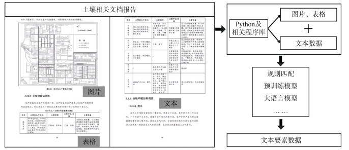2.2 非结构化数据处理土壤相关科研论文、调查报告、评价报告等文档中包含丰富信息,对其关键信息进行结构化识别处理,生成便于直接使用的数据形式,是大数据处理中的重要技术环节[26-27]。以建设用地土壤污染状况调查报告为例,介绍非结构文档识别流程和方法(图 3):首先,构建“图–表–文”主题内容解构方法,对其中的“图、表、文”进行抽取,获取结构/半结构化的表格数据,以及非结构化的图片数据;然后,基于抽取的文本数据,采用自然语言处理方法(Natural language processing,NLP)进行文本要素抽取,获取(半)结构化的文本要素数据。