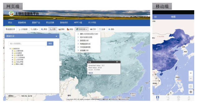 5 土壤大数据应用案例 5.1 基于大数据的土壤信息服务平台基于土壤大数据资源建立的国家级土壤信息可视化与分析平台,支持网页端(http://www.soilinfo.cn/)和移动端(http://www.soilinfo.cn:8080/WebSoil/APP.jsp)(图 6),具有空间数据可视化、空间分析及私有数据管理等功能,提升了土壤数据空间可视化分析水平,以及对决策模型的支撑能力和用户获取土壤数据资源的便利性。