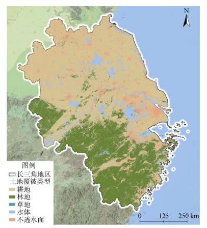 图 1 长三角土地覆被类型空间分布 Fig. 1 Spatial distribution of land cover types in Yangtze River Delta |