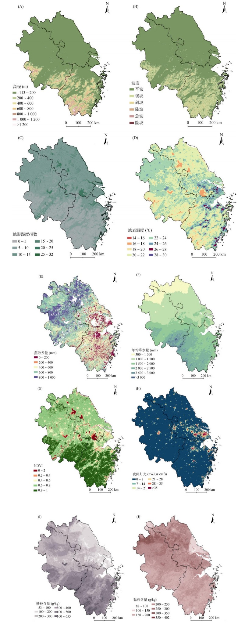图 2 长三角各个环境因子的空间分布 Fig. 2 Spatial distribution of various environmental factors in Yangtze River Delta |