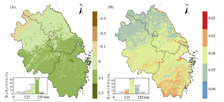 图 3 2015年4月至2018年12月长三角土壤水分MRD (A)及SDRD (B)的空间分布 Fig. 3 Spatial distributions of MRD (A) and SDRD (B) of soil moisture in Yangtze River Delta from April 2015 to December 2018 |