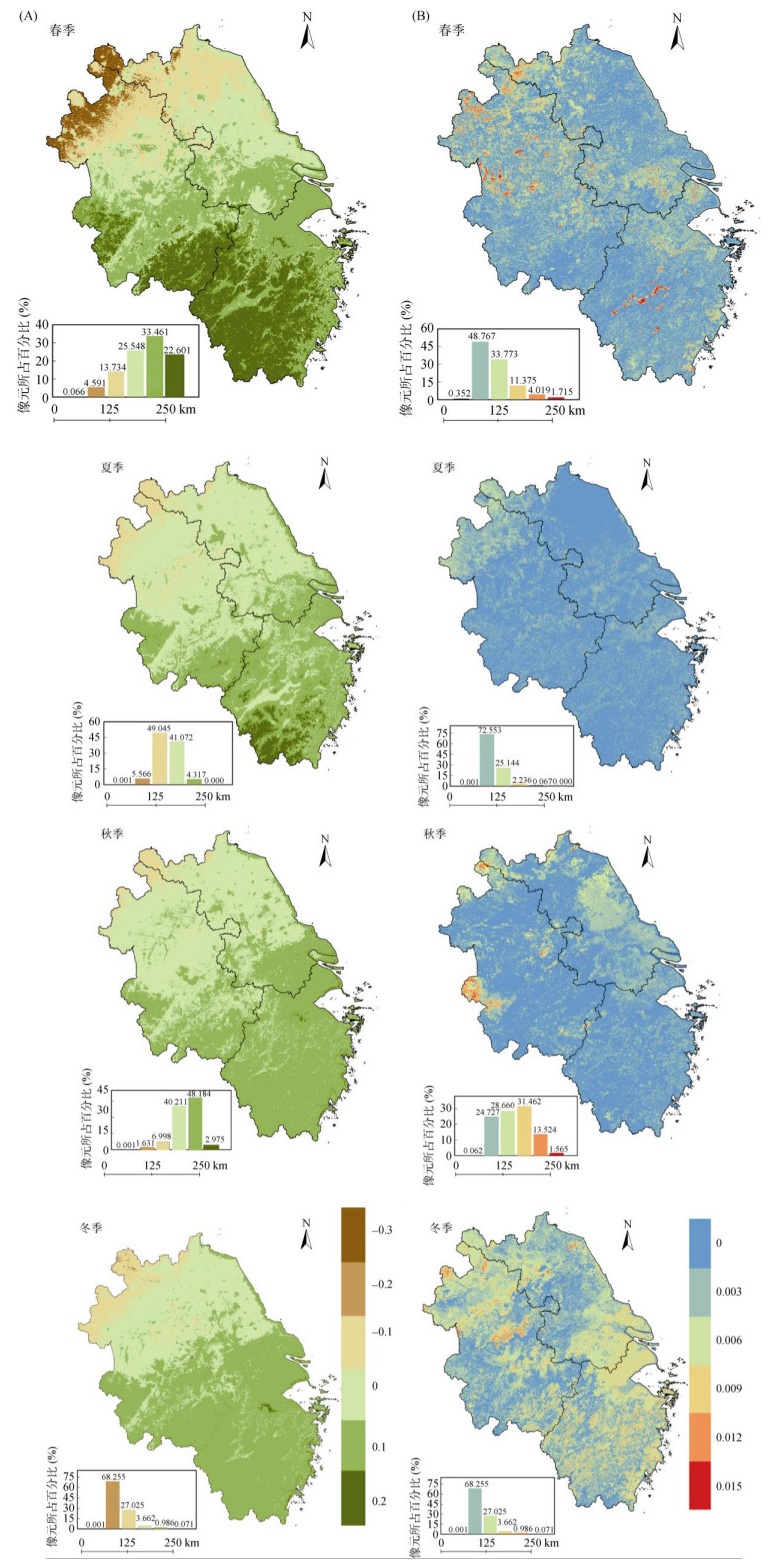图 4 长三角不同季节土壤水分MRD(A)及其SDRD(B)的空间分布 Fig. 4 Spatial distributions of soil moisture MRD (A) and SDRD (B) in different seasons in Yangtze River Delta |