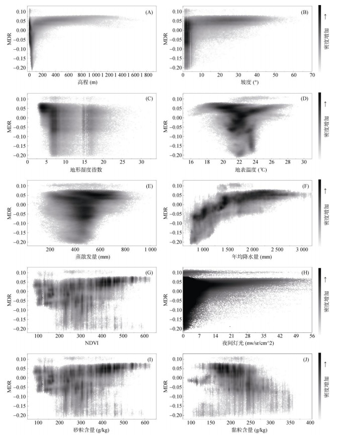 2.3 土壤水分时间稳定性驱动因子 2.3.1 土壤水分时间稳定性对环境因子的响应长三角地区土壤水分的MRD值随着地形、气象、植被、土壤等因素变化,呈现出不同的变化趋势(图 5)。土壤水分MRD值随着高程和坡度的升高而上升,并在高程500 m和坡度15°后趋于平稳。如图 2A和图 2B所示,高程和坡度较高的区域大多分布在南部的丘陵山区,也是降水和植被条件较好的区域,但土壤水分MRD值随着地形湿度指数的升高没有明显的变化趋势(图 2C)。地形湿度指数是根据坡度、坡向和海拔等地形特征衡量可渗透和保留在土壤中的水量,该指数值高表明该区域为水可能积聚并保留在土壤中的区域。前人研究发现,在小尺度区域,地形湿度指数对土壤水分MRD值响应强烈[23],但在长三角地区这种大尺度并且地形复杂区域,土壤水分MRD值受降水影响较大,和地形湿度指数相关性较弱。在气象因子方面,土壤水分MRD值随地表温度和蒸散发量的上升呈先降低后升高的趋势,但该变化规律并不明显。对应于年均地表温度23℃和蒸散发量500 mm时,土壤水分MRD值最低(图 2D、图 2E)。地表温度高和蒸散发强烈的区域,大多同时具有较大的降水量[24],因此土壤水分MRD值较高;地表温度低和蒸散发较弱的区域,由于土壤水分的损失较小[25],使得土壤水分MRD值较高。降水量的升高使土壤水分MRD值上升,并在降水量达1 500 mm后趋于平稳。降水量最高值对应的区域分布在南部高海拔地区(图 2F),虽然降水量大,但高海拔土壤相对贫瘠且保水性差[26],因此降水量增加对土壤水分的提升有限。土壤水分MRD值随夜间灯光指数的上升呈现升高的趋势。夜间灯光指数高的区域大多分布在浙北、太湖流域以及散布在南部丘陵山区的低洼地带(图 2H),这些区域都相对于长三角地区土壤水分值偏高。随着NDVI值的升高,土壤水分MRD值无明显的变化趋势,这主要是因为NDVI值较高的区域主要是林地和耕地,林地主要分布在南部地区而耕地主要分布在中部以及北部地区,使得长三角NDVI空间分布无明显地带性(图 2G)。在土壤质地方面,土壤水分MRD值随砂粒含量的增加平缓上升(图 2I),而随黏粒变化则趋势相反(图 2J),这是由于黏粒含量低且砂粒含量高对应于南部土壤水分MRD值较高的丘陵山区。