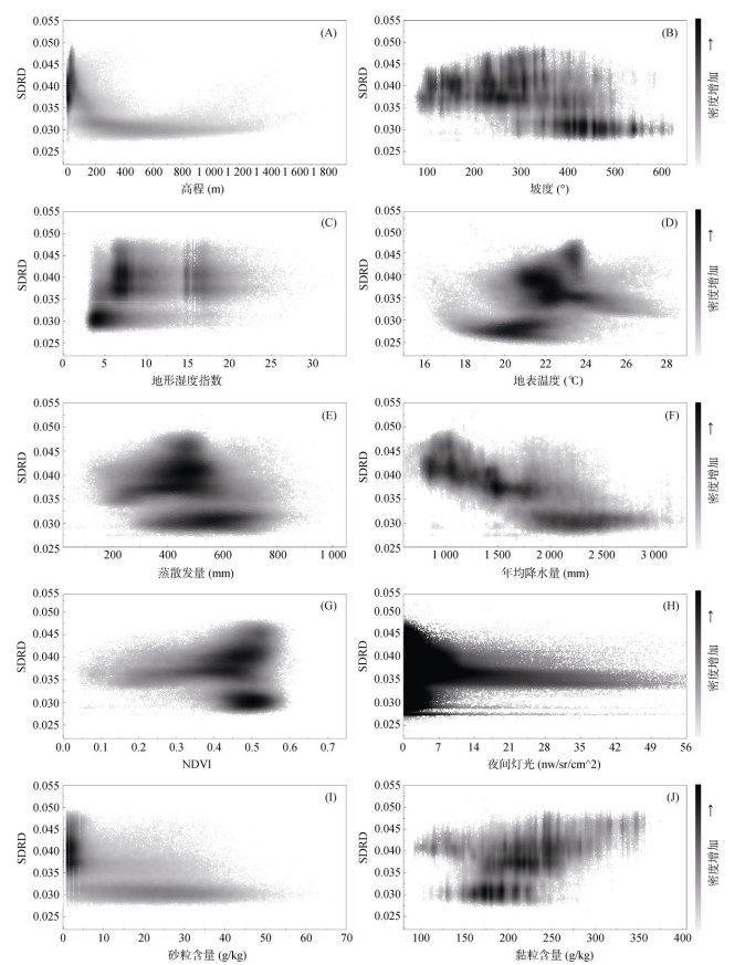 土壤水分SDRD值对不同环境因子空间变化的响应不同(图 6)。当高程和坡度处于低值时土壤水分SDRD值偏高,这部分区域主要分布在地形平坦且水资源相对较少的皖北地区(图 2A)。皖北地区位于温带季风气候和亚热带季风气候的交界处,受季风气候影响,降水时间分布不均匀[27],使得土壤水分波动较大。当地形湿度指数处于高值时,对应区域分布于低洼的湖泊河流地带(图 2C),此时土壤水分时间稳定性最高。在气象因子方面,土壤水分SDRD值随着地表温度升高呈现先上升后下降的趋势,这是因为地表温度低值区分布在南部和西部的高海拔地区(图 2D)。蒸散发量高值区也为南方丘陵地区(图 2E),且该区域的年均降水量和植被覆盖率高(图 2F、图 2G),土壤保水性好[28],土壤水分时间上的波动较弱。年均降水量空间分布由北向南逐渐升高(图 2F),作为最重要的土壤水分来源,降水量大使得土壤水分波动剧烈,因此高降水量往往伴随着高土壤水分SDRD值。由于NDVI值空间分布差异小,土壤水分SDRD值总体对NDVI值响应较弱。夜间灯光指数和土壤水分SDRD值关系呈反向关系,夜间灯光指数低值对应皖北地区,土壤水分SDRD值相对较低。黏粒含量从北向南降低,砂粒含量则相反,黏粒含量的升高和砂粒含量的降低伴随着土壤水分SDRD值的上升,但这并不代表土壤质地在长三角地区这样一个空间尺度对土壤水分波动能够产生影响,而更多的是因为长三角区域土壤质地的空间分布与气象、植被等因子在空间变化具有一定的相似性。