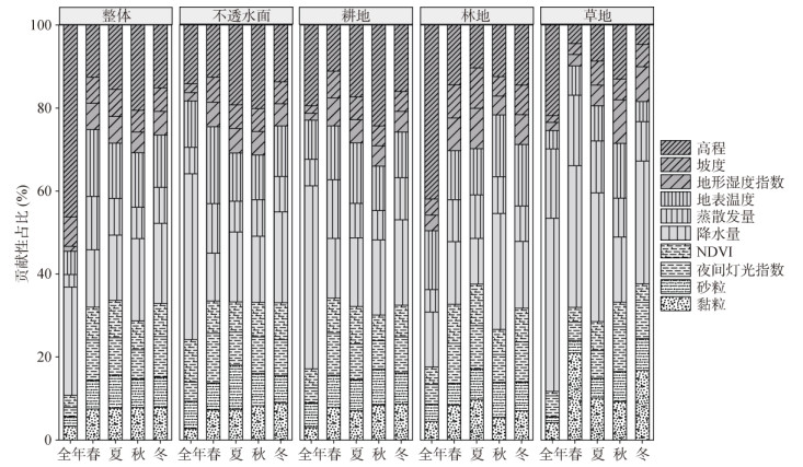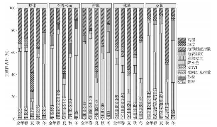 各个环境因子在不同土地覆被类型和季节下,对土壤水分MRD的贡献率既有相似性也有差异性(图 8)。在长三角区域内,全年和春、秋、冬三季,气象因子对土壤水分MRD值空间分布起决定性作用,其次是地形因子和人类活动,而贡献最低的是土壤质地,但在夏季,地形因子的重要性却强于气象因子。主要原因是全年和春秋冬三季的长三角地区降水空间分布不均匀,温度和蒸散发量地区差异大,所以气象因子对土壤水分MRD值分布贡献率最大。在夏季时,降水量为全年峰值且南北空间差异较小,而地形因素如坡度和海拔会对降水产生明显的再分配作用[30],因此夏季降水对土壤水分MRD值空间分布的贡献率降低。对于不透水面和耕地,土壤水分MRD值对夜间灯光指数和NDVI值响应强烈。在一定程度上,不透水面和耕地可以表征人类活动,不透水面是人类活动影响剧烈的覆被类型,耕地土壤水分则是因为受到种植作物类型和管理措施的影响,因此两种土地覆被类型对夜间灯光指数和NDVI敏感。对于林地,降水对土壤水分MRD影响较小,地形因子在其中响应相对强烈。这是因为林地分布在南方丘陵地区,降水空间分布差异小,海拔和坡度变化大影响了土壤水分分布,从而对土壤的干湿程度响应强烈。而草地相对于林地,冠层覆盖较小,并且分布在降水量相对较小的区域,所以蒸散发量对土壤水分MRD重要性较强。