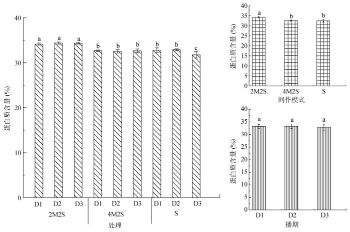 2.3 鲜食大豆蛋白质变化在所有处理中,2M2S模式的D1、D2和D3处理鲜食大豆蛋白质含量均显著高于其他处理,而S模式的D3处理最低(图 1)。进一步比较发现,不同间作模式中2M2S模式的鲜食大豆蛋白质含量显著高于4M2S和S模式,分别比4M2S和S模式提高了5.1% 和5.5%,而3个播种期D1、D2和D3处理的鲜食大豆蛋白质含量则无显著差异。