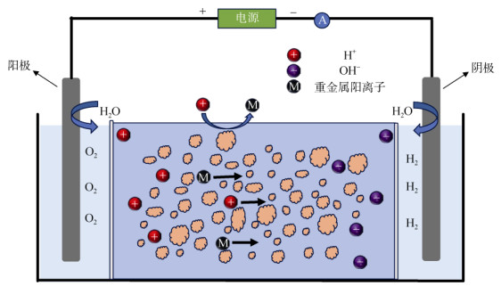 1 电动修复技术原理及局限性 1.1 电动修复技术原理电动修复即通过电场的作用将重金属迁移富集至电极附近,随后去除,实现重金属与土壤分离的技术手段[11]。试验装置如图 1所示,使用两个相反的电极,即阳极和阴极,随后施加一定的电压梯度,由此产生强电流密度,驱动重金属活化,促使电场中的重金属污染物迁移至与其带相反电荷的电极附近,在相关电极附近积聚,以达到被去除或进一步回收[12]。污染物的迁移是由电迁移、电渗流、电泳决定的,对于土壤重金属修复,通常是通过电迁移和电渗流作用向阴极移动[13]。